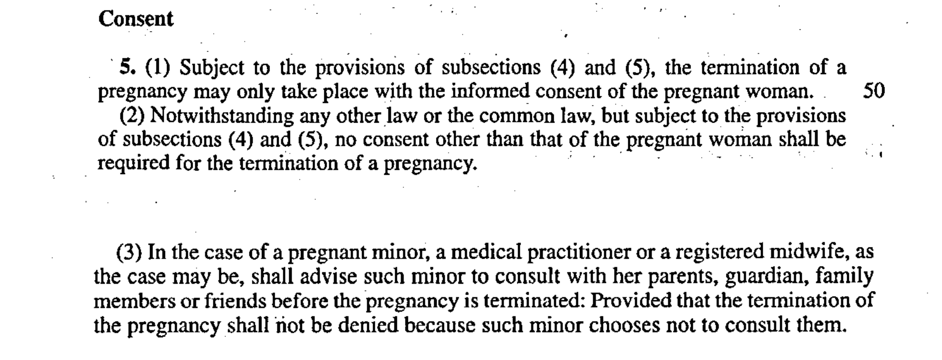 (3) In the case of a pregnant minor, a medical practitioner or a registered midwife, as the case may be, shall advise such minor to consult with her parents, guardian, family members or friends before the pregnancy is terminated: Provided that the termination of the pregnancy shall riot be denied because such minor chooses not to consult them. (a minor can get abortion without consulting parents).“