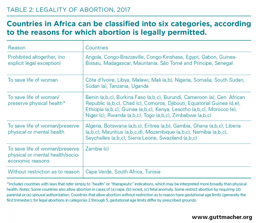 According to a study done by the Guttmacher Institute in 2017, about Abortion in Africa, Cape Verde and Tunisia are the only African countries similar to South Africa in allowing abortion without restriction as to reason. Refer to table: